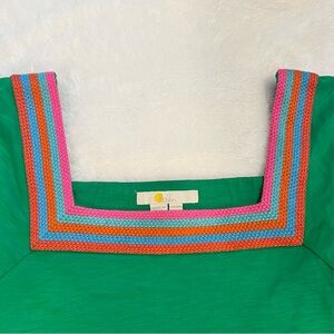 Boden embroidered tunic dress in Emerald Green with a square neckline and vibrant embroidered stripes at the cuffs and neck. Light material made with 100% cotton.