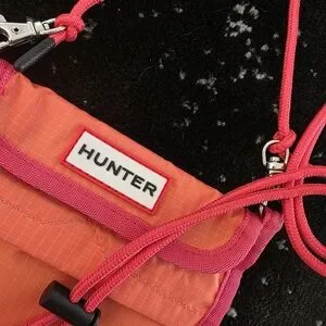 Keep your phone and small essentials safe and dry with this Hunter Original Packable Phone Pouch. The water-resistant hiking bag can be easily carried with the strap, and features a zip and velcro closure. Made of durable nylon and has a solid pattern. The lining is made of polyester and nylon, with a vibrant orange color that perfectly complements the pink accents.