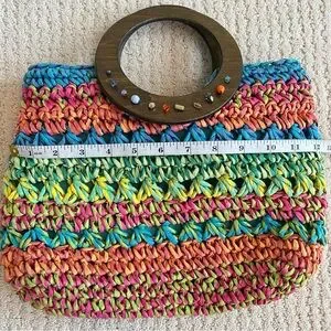This bag is a multicolored beachy beauty! Hand crocheted from Toyo straw with two beautiful wooden circular handles featuring bead details. Perfect pairing for a sundress or cutoffs. Easy going, fresh and youthful style.