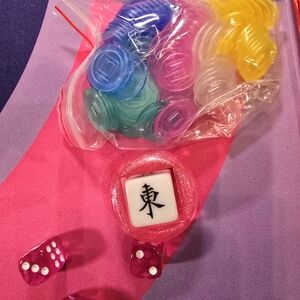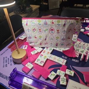 166 Tiles American Mahjong set. Champagne bottles are craks, Disco balls are dots and martini glasses are Bams with a cute Flamingo as Birdie Bam, and champagne bottles with wrap around Dragons. Includes matching bag and tile with fringe Keychain attachment. Perfect for holiday, birthday, or any celebration and engaging play. Brand new in original packaging.