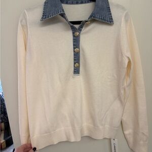 Stylish cream sweater with denim collar and cuffs. Perfect for casual elegance.