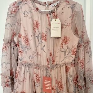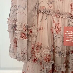 Elegant floral maxi dress. Features delicate ruffle details. Perfect for any occasion.