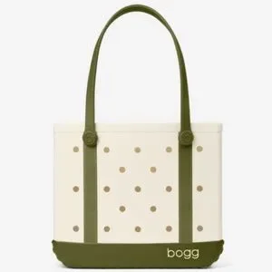 NWOT medium size Baby Bogg® Bag in Academy Moss with moss green handles, buttons and detailing over a coconut (off white) body. This versatile 4 lb. bag is made of durable, washable EVA with a sturdy, stiff-sided tip-proof design, tonal "B" handle buttons and a 40 lb. carry weight limit. Dimensions are 15 in. L x 5 in. W x 12.5 in. H. Comes with an attached small matching see-through zippered insert (7 in .L x 5 in. H x .25 in. W when flat) that opens to approximately 1.5 in. wide. Condition is NWOT never used with no defects or damage. Comes from a smoke, pet and fragrance free home. **Shipped with handles rotated to lay flat against the bag's sides so you will need to rotate handles to their upright position upon receipt.