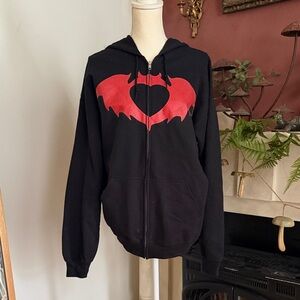 Stylish black hoodie featuring a bold red bat heart clandestine industries logo on the front. Perfect for casual wear. This is a custom hoodie and is not clandestine industries brand.