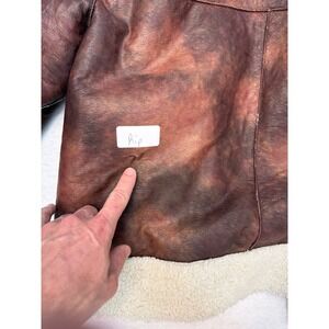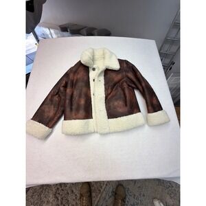 Reversible aviator jacket offers two distinct looks, featuring a distressed brown faux leather side and a plush cream faux shearling side. Designed with a classic spread collar, button-front closure, and side welt pockets, this versatile piece provides a cozy yet edgy aesthetic. The boxy silhouette and dropped shoulders create a modern, relaxed fit perfect for layering during colder months.