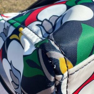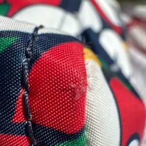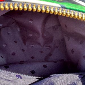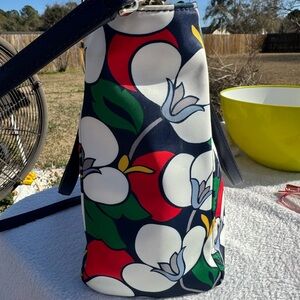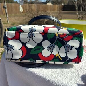 Kate Spade Dawn Breezy satchel with adjustable, removable crossbody strap. Gorgeous, vibrant floral pattern. Easy to clean nylon with leather trim and gold hardware. Large center magnetic snap closure with a zipper pouch and two slip pockets. Both zipper compartments are also nice and roomy. Comes with care card. All 4 corners have some wear that you have to look hard to see and there is a very small wear section on one of the satchel handles. All call outs in the photos.