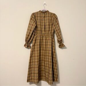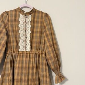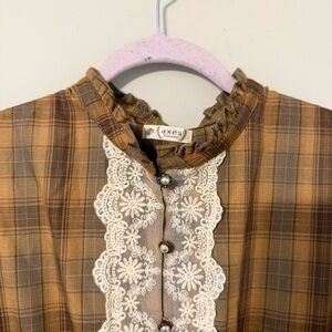 Axes Femme plaid maxi dress with brown and orange autumn hues, pearl accent buttons, and lace trim on the bust. Cute and elegant piece similar to cottagecore or kawaii lolita styles by Liz Lisa, Angelic Pretty, Baby the Stars Shine Bright, Bodyline, Hot Topic, Widow, etc. Purchased in Japan. Marked size M, but please refer to measurements for accurate sizing.