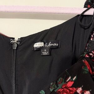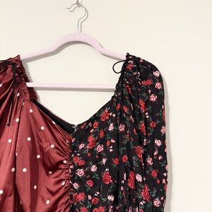For Love & Lemons ruched sweetheart dress with a split polka dot and floral rose print in style Cher. Long sleeve with ties, back zipper, and decorative red button gems. There’s a thread pull on the polka dot half as pictured, but the dress is in excellent condition otherwise!