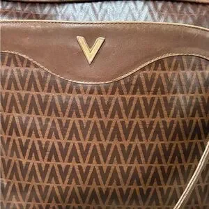 This brown messenger bag features a sophisticated chevron pattern, crafted from sleek leather for a polished look. The bag includes a matching leather shoulder strap and a metallic V-shaped emblem for added style.