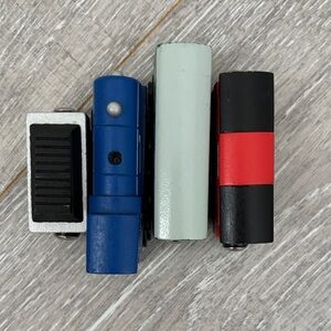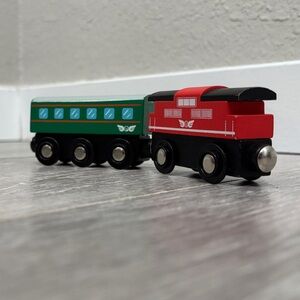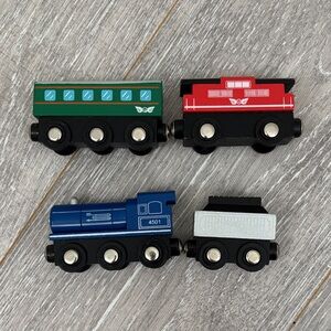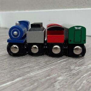 Lil Chugs - Wooden Passenger Express Train 4pc Set. Includes red caboose, green passenger car, blue locomotive and coal car. Good preloved/played with condition, please review photos closely.