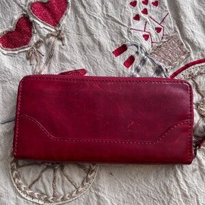 Frye Melissa zip around red leather full size wallet for women, perfect for everyday use.