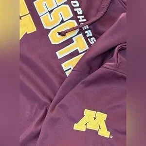 The Minnesota Golden Gophers Long Sleeve Hoodie in size Large is a stylish and omfortable garment perfect for any fan of the University's team. Featuring a solid naroon color with a stitched logo, this officially licensed hoodie is made of polyester naterial and is machine washable for easy care. The unisex adult design makes it a ersatile choice for any supporter of the Minnesota Golden Gophers. Show your team pirit with this high-quality Stadium brand hoodie. Measures 23.5" armpit to armpit ind 26.5" neckline to hemline. Excellent condition.