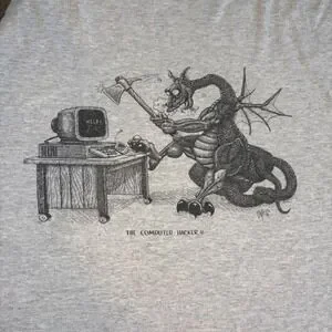 Vintage Jerzees Heavyweight Blend t-shirt in a classic heather gray, featuring a detailed "The Computer Hacker" graphic of a dragon attacking a computer with an axe. This 90s-style tech humor tee is crafted from a comfortable 50/50 cotton-polyester blend, offering a soft feel and durable construction with a ribbed crew neckline and short sleeves. Perfect for fans of retro computing, fantasy art, or quirky vintage streetwear.