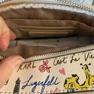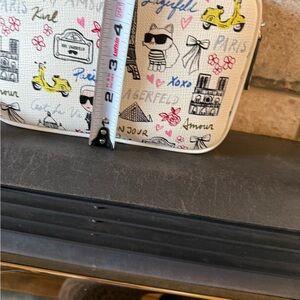Chic Karl Lagerfeld Crossbody with Parisian motifs. Features landmarks and playful icons. Ideal for travel or everyday use.