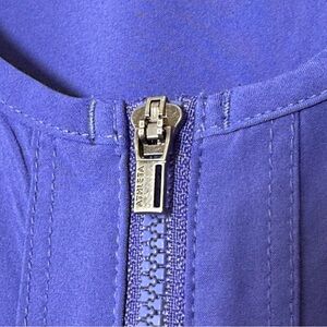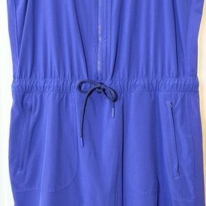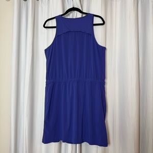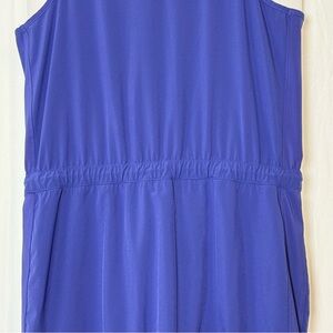 Athleta Expedition skort dress designed as a romper-style silhouette with built-in mesh shorts for coverage and comfort. Color is a purplish blue. Features a sleeveless scoop neckline with partial zip front, adjustable elastic drawstring waist, functional pockets, and lightweight stretch fabric suited for travel, walking, and warm-weather activities.