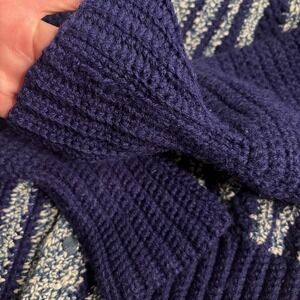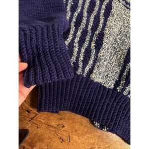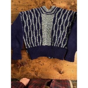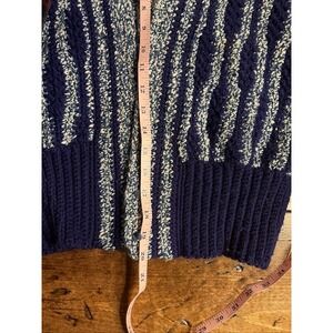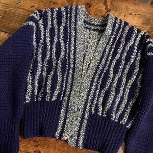 A truly special vintage handmade crochet cardigan, crafted with incredible detail and intention. The bold navy and cream color palette, sculptural texture, and dramatic sleeves make this a statement knit that feels both timeless and completely on-trend.