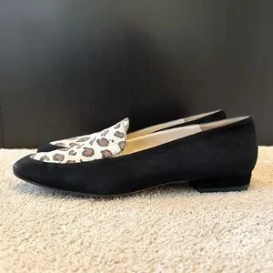 Beautiful St. John loafers made in Italy featuring a soft black suede body with a leopard print top panel. A chic, timeless style that works perfectly for the office or everyday wear.