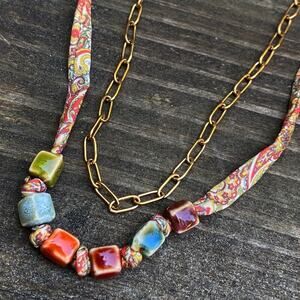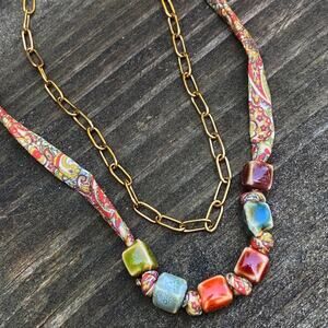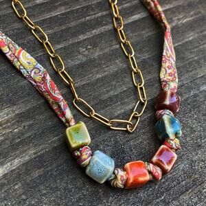 NEW Ceramic Bead & Paisley Printed Cloth Layering Necklace Set