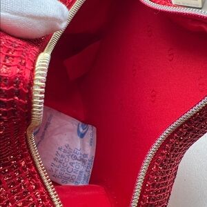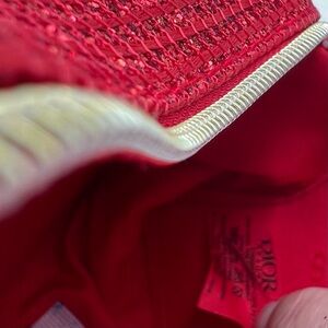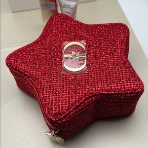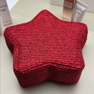 Red star-shaped cosmetic bag with Dior logo. Perfect for storing beauty essentials.
