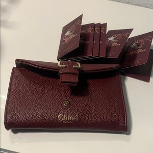 New Women's Chloé Burgundy Gold Buckle Cosmetic Pouch Bag with 6- perfume sample