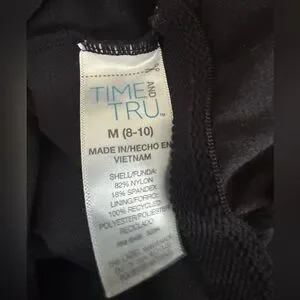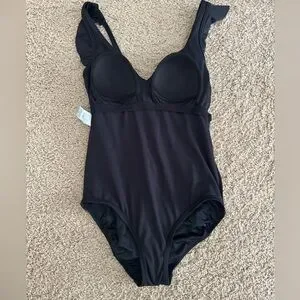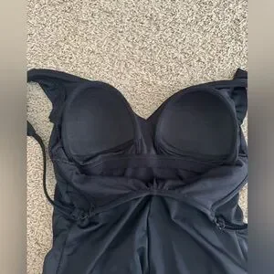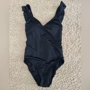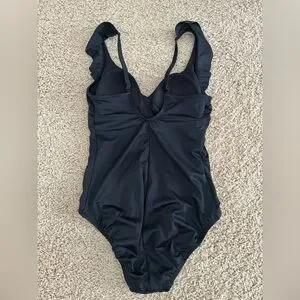 Turn heads at the beach or pool in this stunning black one-piece swimsuit from Time and Tru. Feel confident and modest with this full coverage swimsuit that features adjustable straps, with ruffle details and built-in cups making it comfortable and supportive for all-day wear. The M size is perfect for women who wear sizes 8-10.