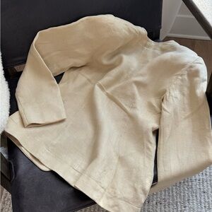 This blazer has a beautifully structured silhouette with shoulder pads, giving it a polished, architectural shape while still feeling light and breathable thanks to the linen fabric. Finished with a classic notched lapel, tortoiseshell-style buttons, and a tailored fit that works effortlessly for both casual and elevated styling.