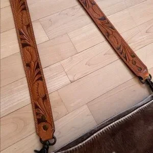 Brown and white, real leather, hair on purse. With fringe detail and carved leather strap. Have carried it at a few rodeos and events, but very little signs of wear. Would be super cute for skijor or to add a western touch to any outfit.