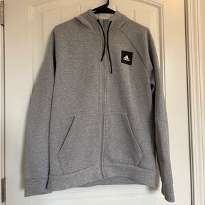 Stylish heather gray hoodie with full zip. Features front pockets and Adidas logo patch.