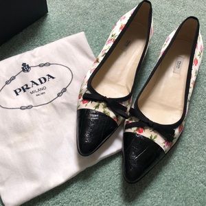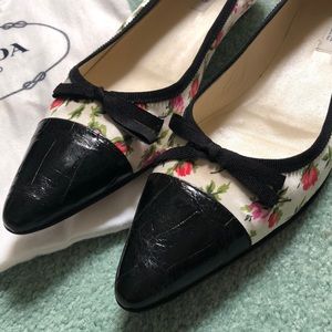 Gorgeous Prada Calzature Donna satin white flats covered in pink& red roses. They feature a pointed toe that's covered in black leather and has a small black ribbon bow over the toe box. They're a comfortable US 8.5 and a great for work or for brunch, lunch, dinners, really anything. They are so beautiful that I'm a little intimidated by them. Excellent condition