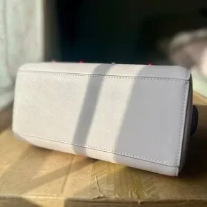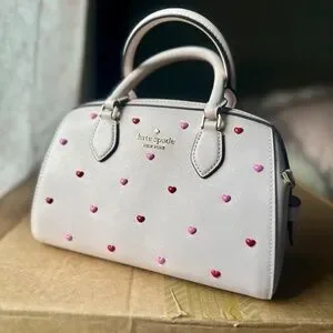 This is a NWOT bag and card holder. It has only been used ones. The main color is a pale pink with red and pink heart embellishment. It comes with the cross body strap.