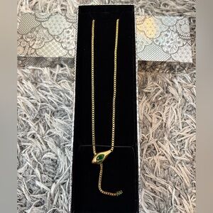 Gold tone necklace featuring snake charm with green gems, adjustable back closure, and small charm with "TS" logo engraved at clasp.