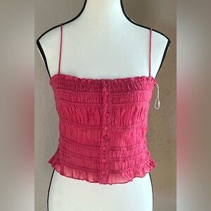 Stylish pink tank top. Features button front and ruffled hem. Perfect for casual wear.