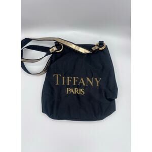 A black tote bag with gold lettering that reads 'TIFFANY PARIS'. It features gold-colored straps and metal rings for attachment.