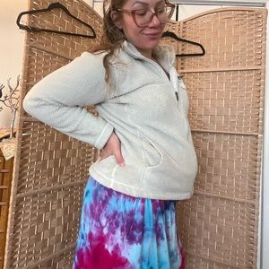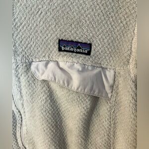 Cozy full zip cream colored Re-Tool fleece from Patagonia. Worn good condition with one small faint charcoal stain on left sleeve cuff (see last photo). Breast pocket and hip pockets. So soft and warm. Women’s large.