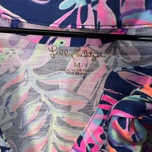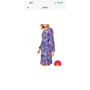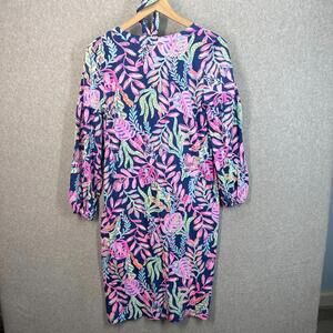 The Lilly Pulitzer Kierna Knee Length Dress in Oyster Bay Navy is a stylish and versatile piece perfect for various occasions. Featuring a flattering V-neckline, long sleeves, and a pullover closure, this dress offers a comfortable fit with a touch of stretch for ease of movement. Made from 100% cotton jersey fabric, it is machine washable for easy care. The dress is adorned with a belt and side slits, making it a practical and fashionable choice for beach outings, casual parties, or even travel. With its eye-catching pattern and classic blue color, this Lilly Pulitzer dress is a must-have addition to any woman's wardrobe.