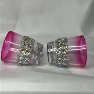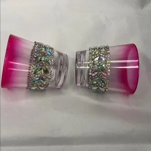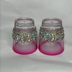 Set of two pink Plastic shot glasses with rhinestone embellishments. Perfect for adding sparkle to any occasion.