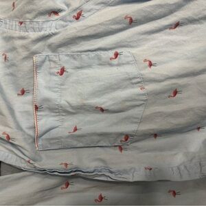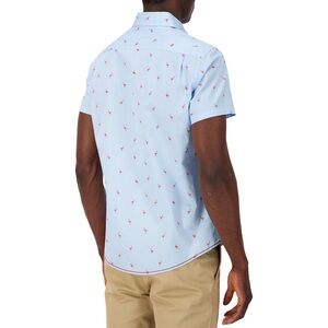 Stylish light blue shirt with flamingo print. Ideal for casual wear. Short sleeves and button-down design.