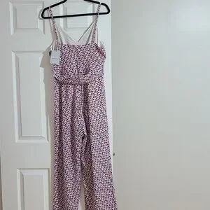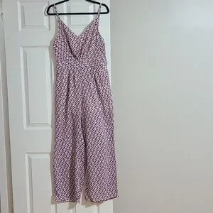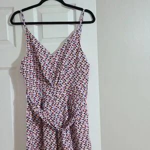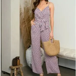 Cute women's v-neck multi color self tie jumpsuit with pockets. The jumpsuit is 100% Polyester.