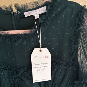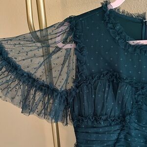 🍋 Details: Make your fairy tale fantasy come true with this forest green tulle stunner from Ivy City Co. Purchased for Christmas when I was a different size and now she’s ready for her new home! Four layers of tulle overlaid on an opaque liner featuring bell sleeves for extra drama and romance. Zip closure at back with hook and eye at nape. Last photos from their website to depict fit.