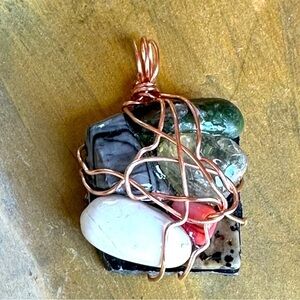 Collage Necklace Pendant, Handmade assemblage Wire Wrapped real Stones 4300 G