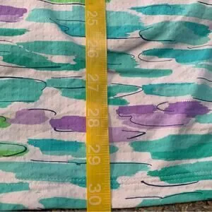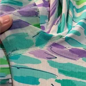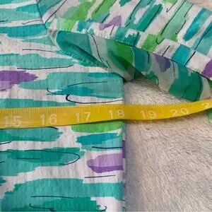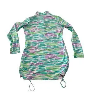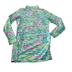 Ibkul tunic length long sleeve shirt. Women's size medium, good condition some separation at arms. Vibrant SPF tunic with turquoise, purple, and light green pattern. Ideal for beach or sporting events.