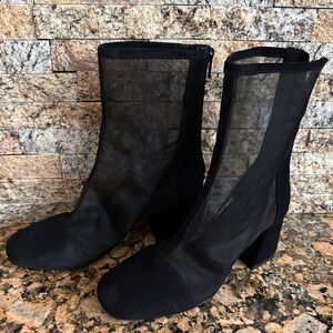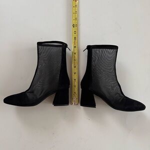 Mesh side panels amplify the trend-savvy appeal of a cap-toe bootie set on a cushioned footbed and wrapped block heel.