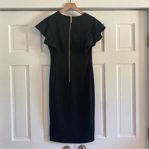 Elegant black dress with ruffle sleeves. V-neck design. Perfect for formal occasions.