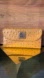 Elegant mustard leather wallet with textured design. Features signature logo plaque.