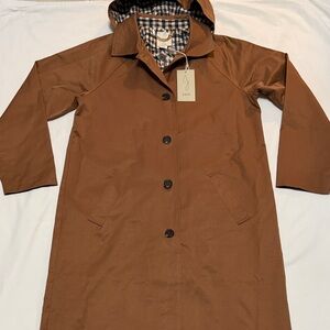 Stylish brown trench coat with detachable hood. Features button closure and plaid lining.