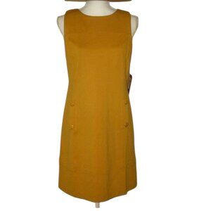 💛 Sleeveless Vince Camuto sheath dress in a rich mustard yellow. -Features chic gold button accents at the hips. Classic, flattering silhouette.