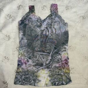 Edgy-meets-romantic vintage Y2K tank with a detailed fleur-de-lis rhinestone design, intricate lace trim straps, and an abstract tattoo-inspired background print in muted purples, greens, and greys. Made from a stretchy, body-hugging fabric that flatters the figure.