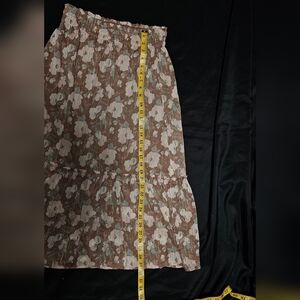 Chic floral midi skirt. Elastic waistband, built in slip. Brown base, Cream & Sage florals. Size S