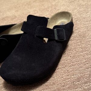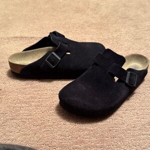 Stylish black suede mules by Birkenstock. Comfortable and versatile design. Perfect for casual wear.