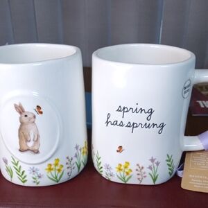 Charming Rae Dunn mugs with floral and bunny artwork. Perfect for springtime sips.